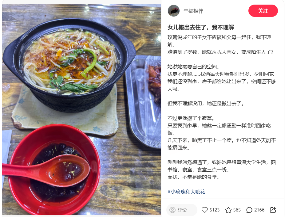 一位母亲在小红书平台的分享,对于女儿搬出去的行为,产生的怀疑是“到了岁数我们就成陌生人了?”“我给的空间还不够大吗?” / 图源小红书博主@幸福相伴,已授权
