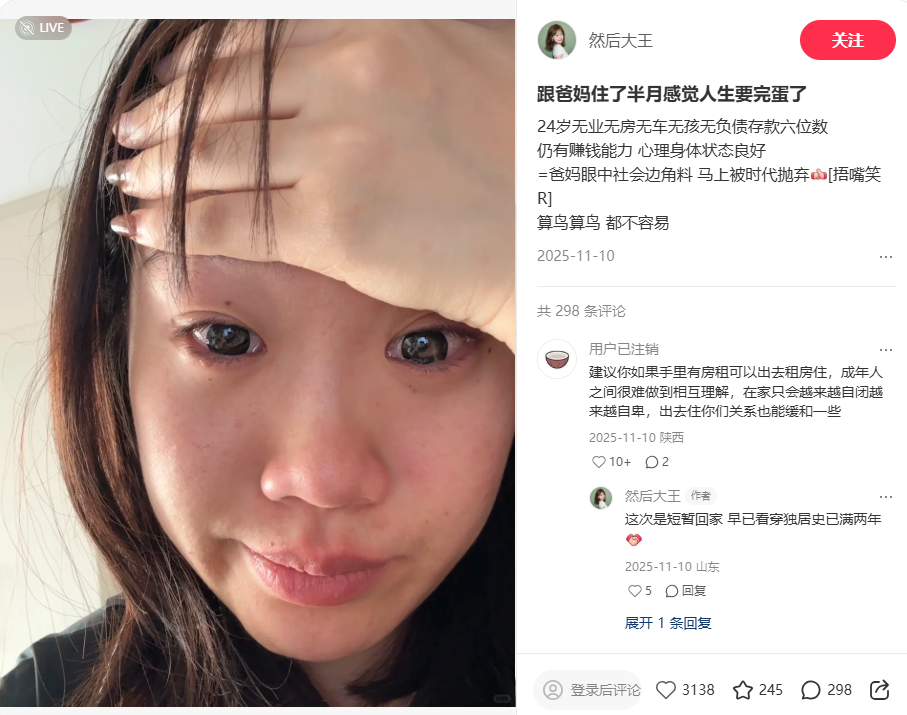 一个存款六位数的年轻人,在父母眼里依然可能被贴上“社会边角料”的标签 / 图源小红书博主@然后大王,已授权