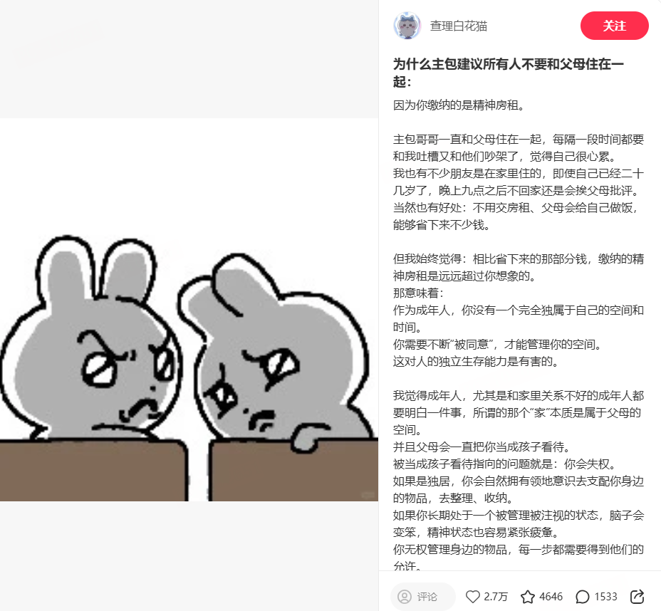 而对于广大即使种种不适但迫于经济原因和父母同住的成年人,我很理解这样的妥协。