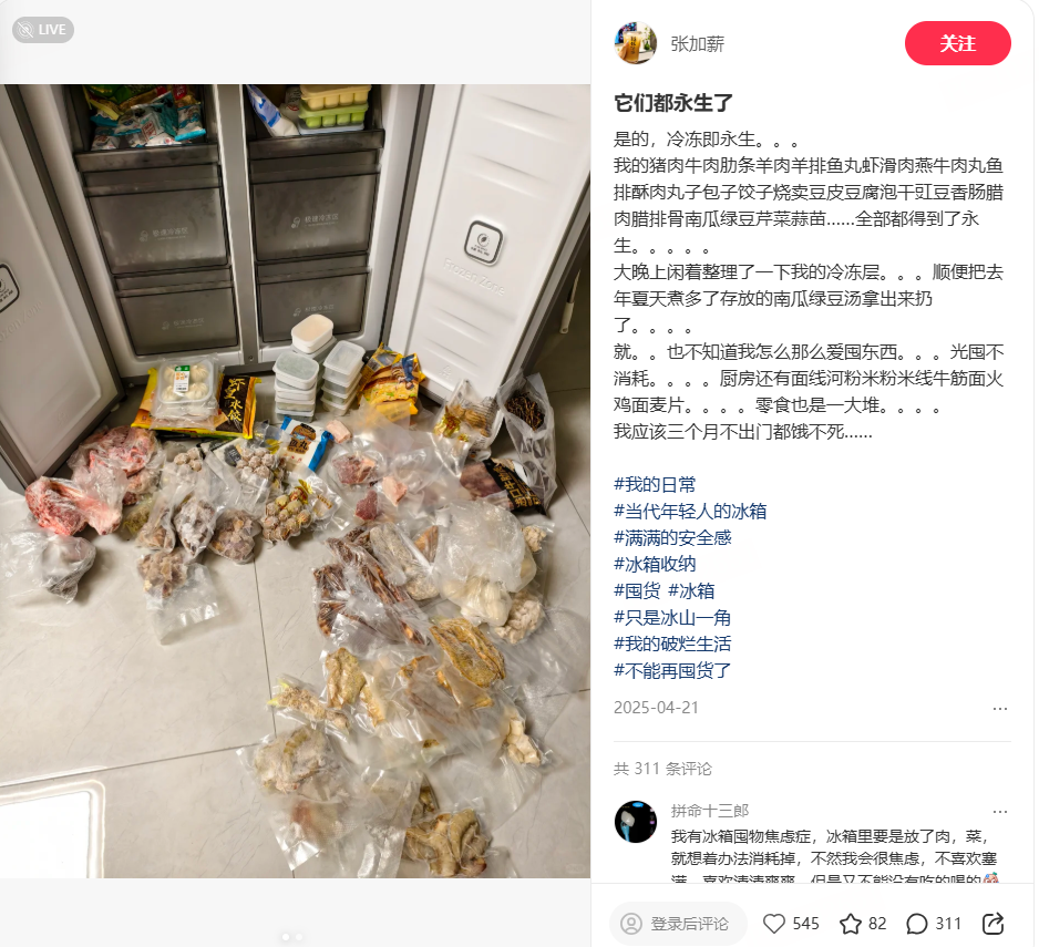 如果你希望冰箱整整洁洁的,而你的父母却是爱囤货的,大概率你们的矛盾不会小 / 图源小红书博主@张加薪,已授权