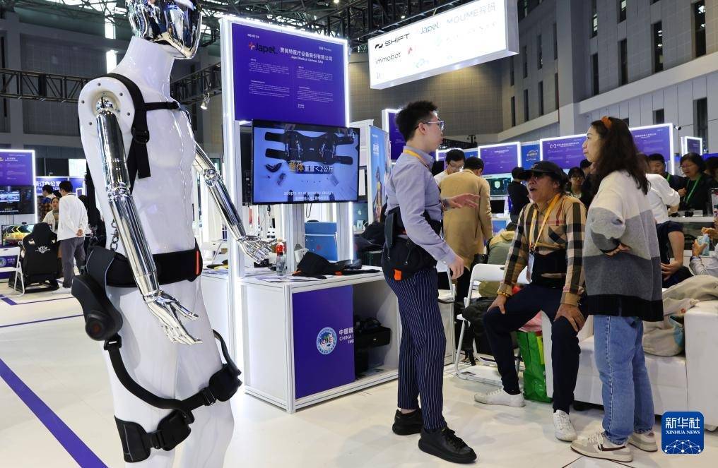 11月9日,工作人员(左)在向参观者介绍一款外骨骼产品。