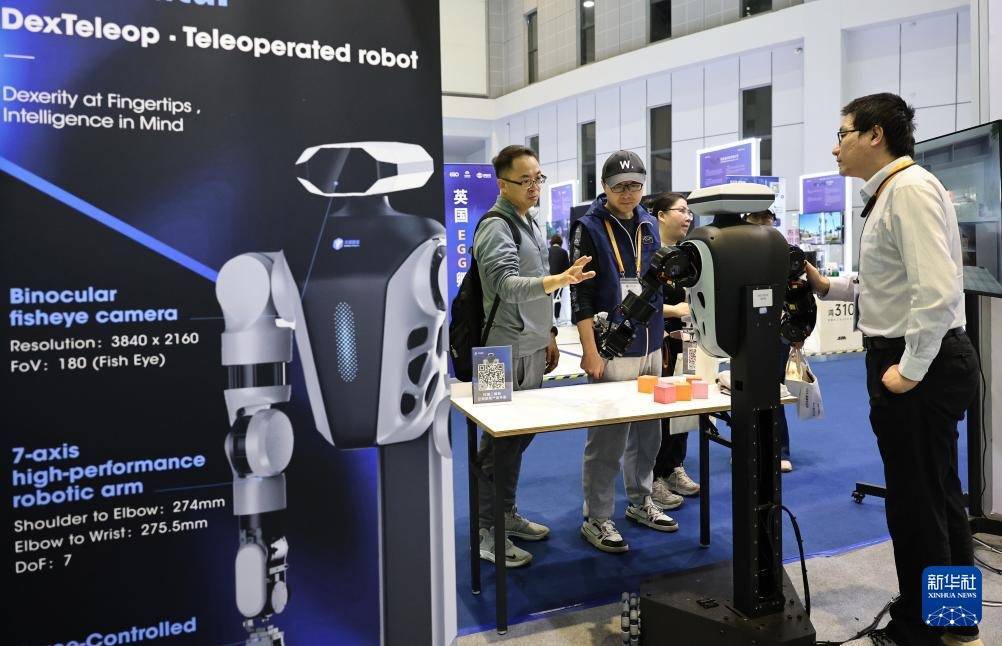 11月9日,参观者(左)在一个配备双目鱼眼镜头视觉组件的遥操作机器人展品前与工作人员交流。