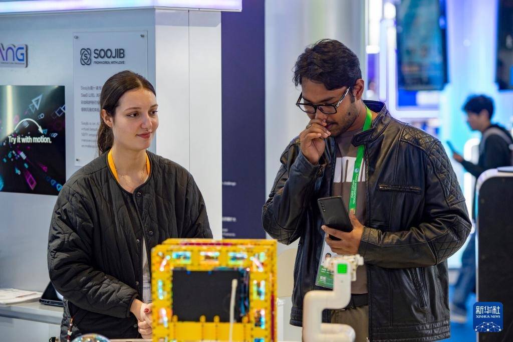 11月9日,在创新孵化专区,参观者(左)体验可穿戴设备。
