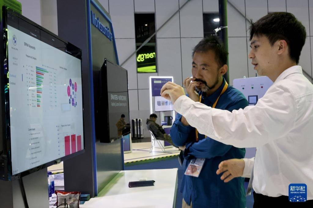 11月9日,工作人员(右)向参观者介绍应用于移动行业的人工智能驱动数字解决方案。