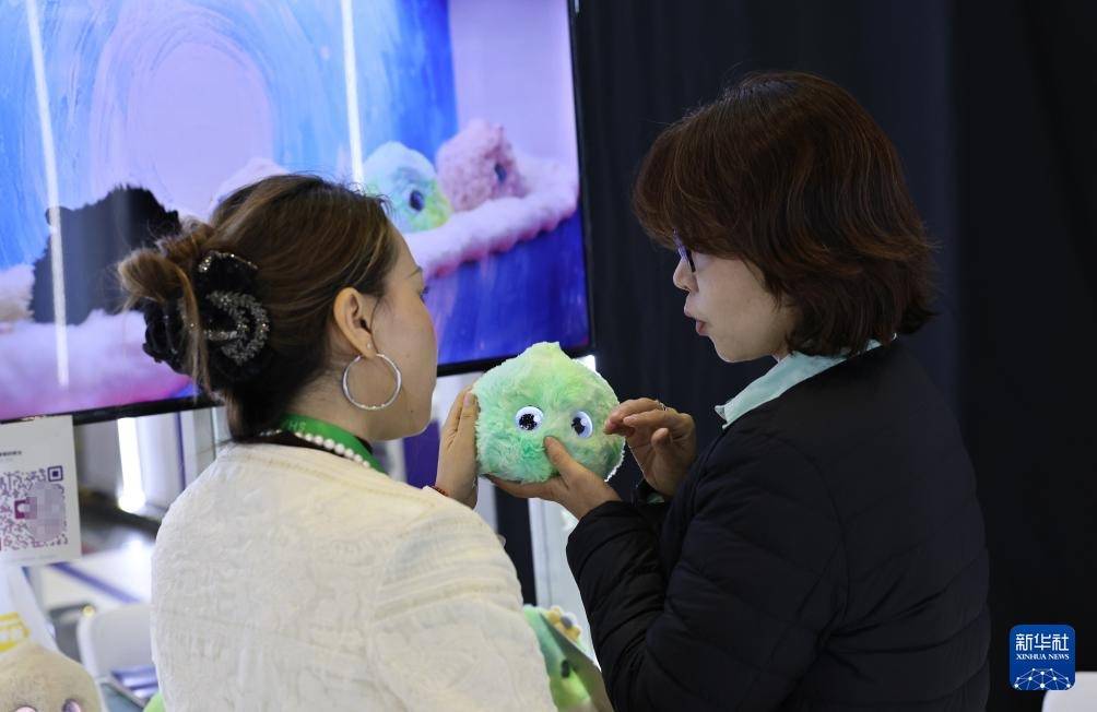 11月9日,工作人员(右)为参观者介绍一款情绪疗愈AI机器人。
