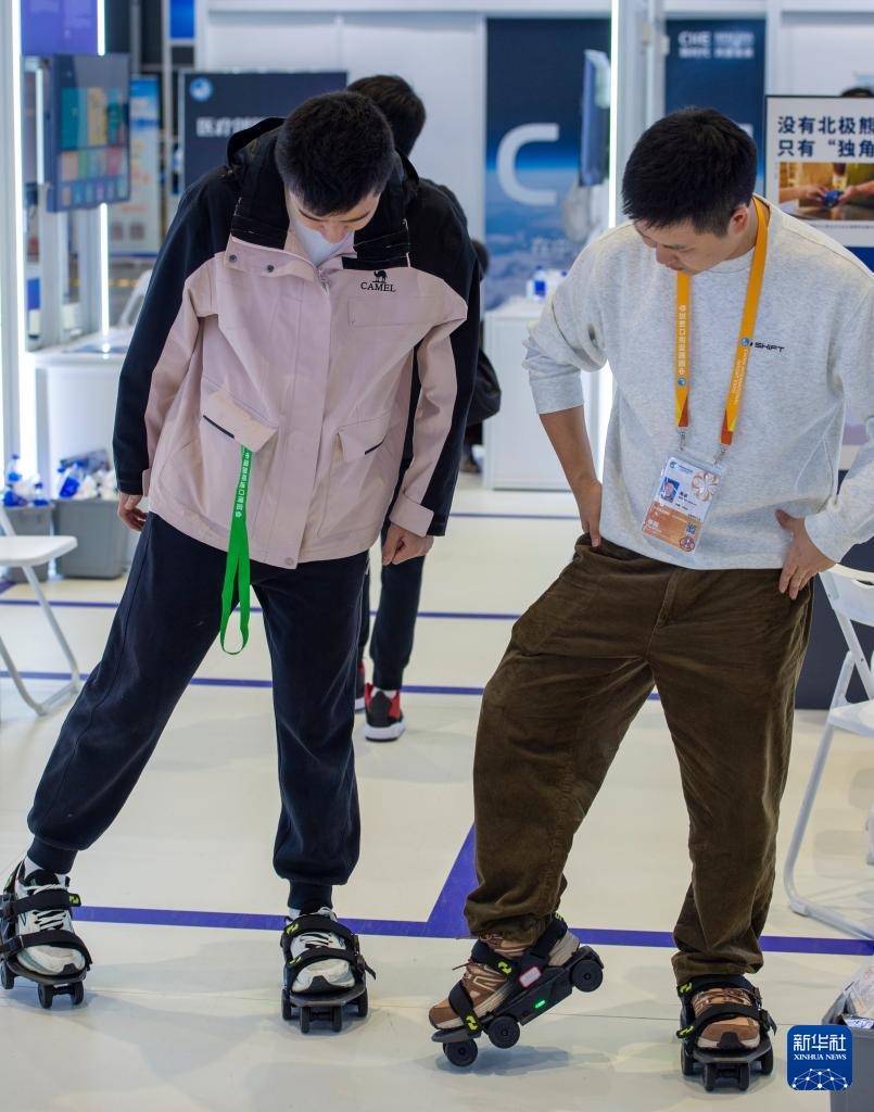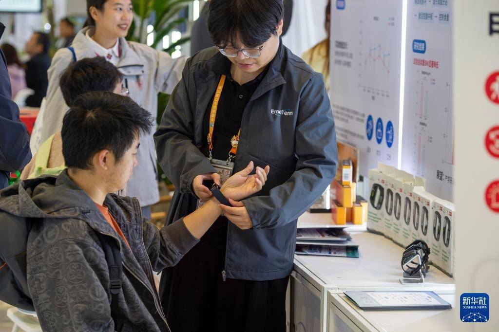 11月9日,在创新孵化专区,参观者(左)体验防晕车手环。