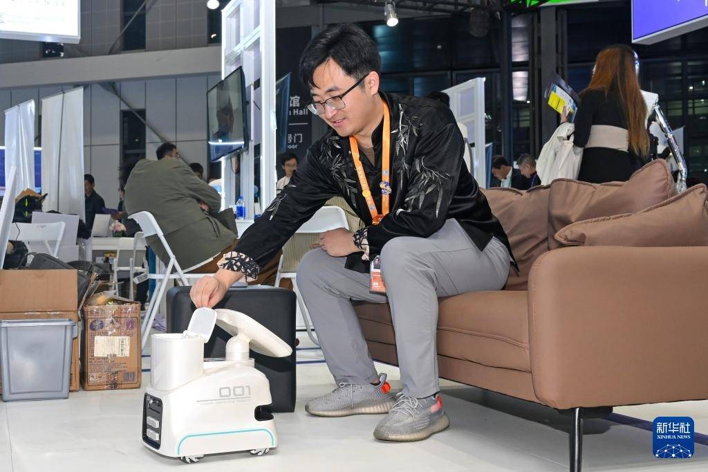 11月7日,展商在创新孵化展区演示一款养老机器人产品。
