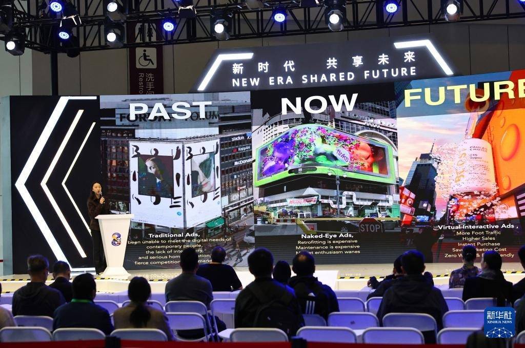 这是设在创新孵化专区内的产品发布宣介区仁信,一位参展商正在介绍基于AI技术的虚拟广告产品(11月9日摄)。