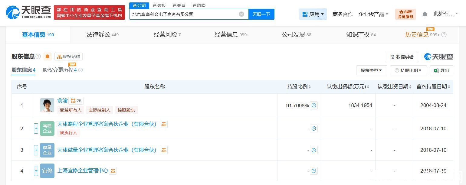 天眼查App显示,近日,北京当当科文电子商务有限公司发生工商变更,李国庆退出该公司股东行列创盈中心,退出前持股约27.5%。